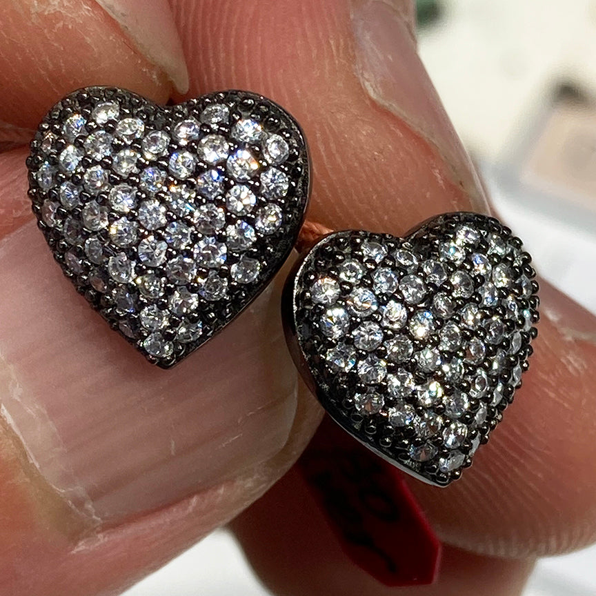 Monochrome Puffy Pave Heart Stud Earrings (Silver)