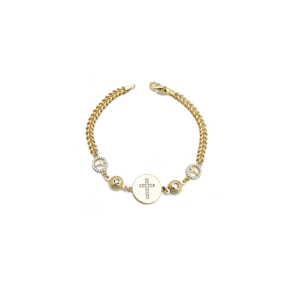 Cross Charm Wheat Link CZ Bracelet (14K).