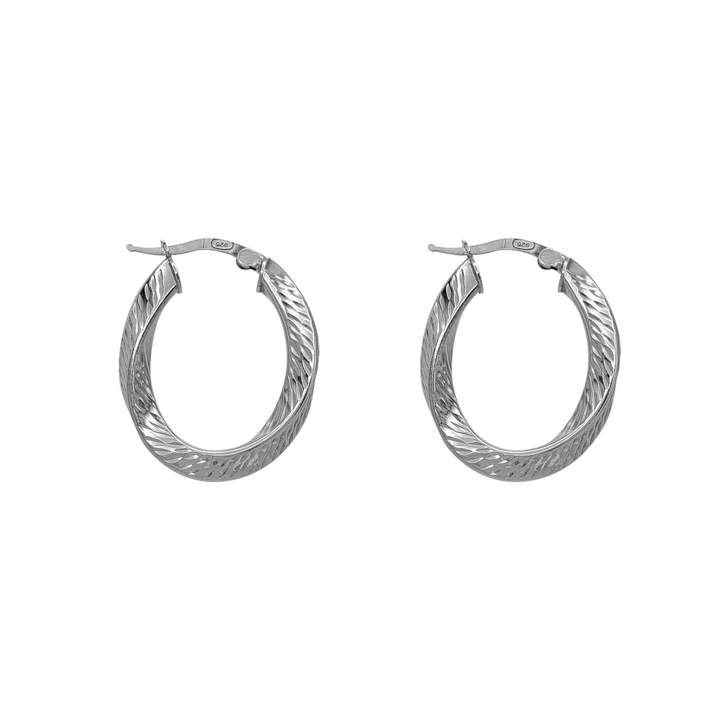 Twisted Diamond-cut Oval-Shape Hoop Earrings (Silver)
