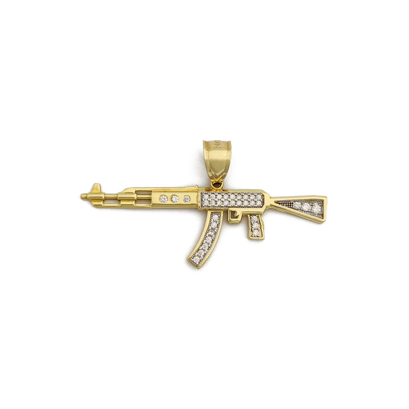 An icy gold rendition of the AK-47 rifle featuring white zirconia on the magazine clip and stock accentuates the rifle pendant.