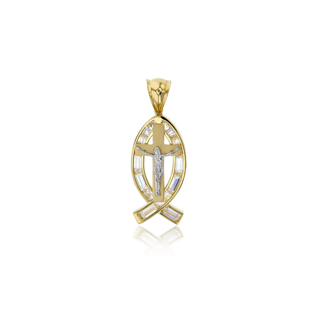 Yellow Gold CZ Jesus Fish Cross Pendant (14K)