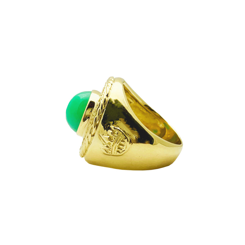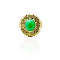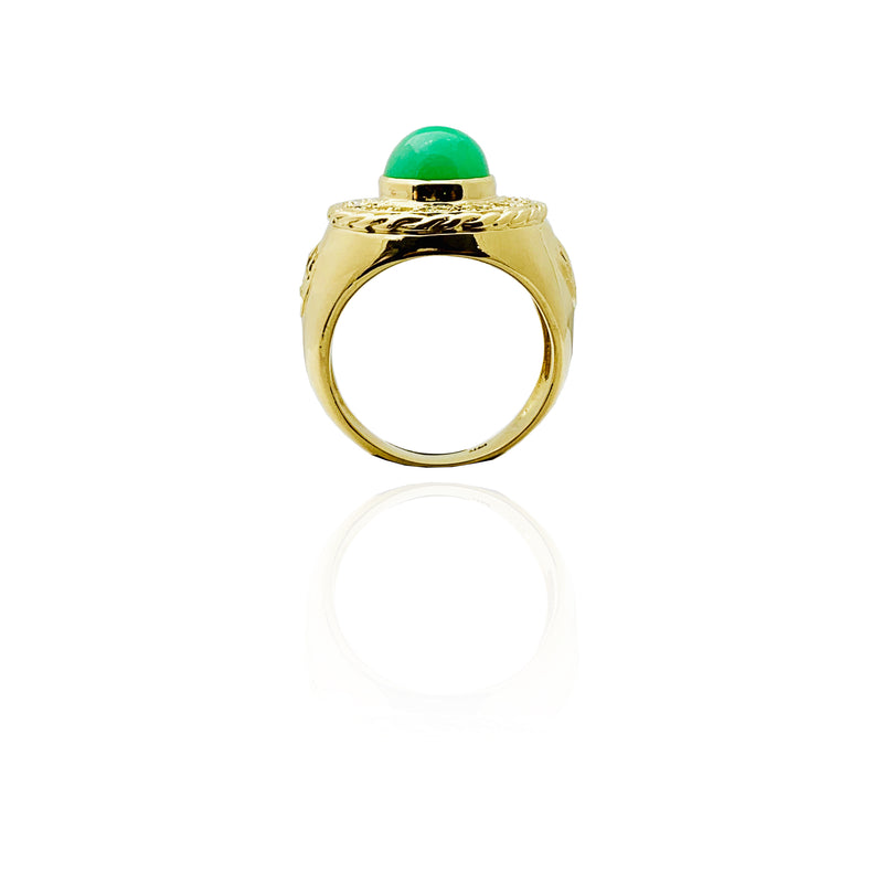 This ring features a deep, marbled green jadestone atop a diamond-crusted bezel.
