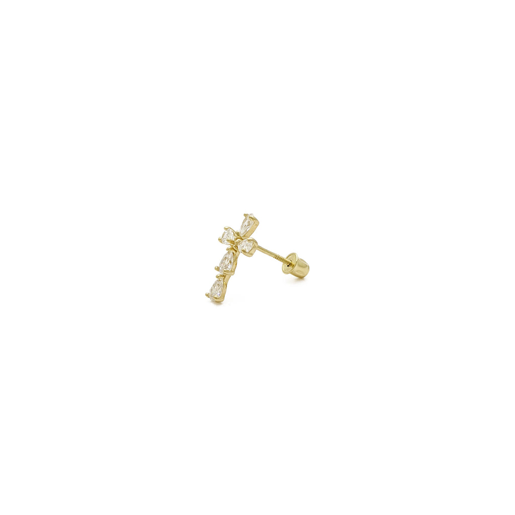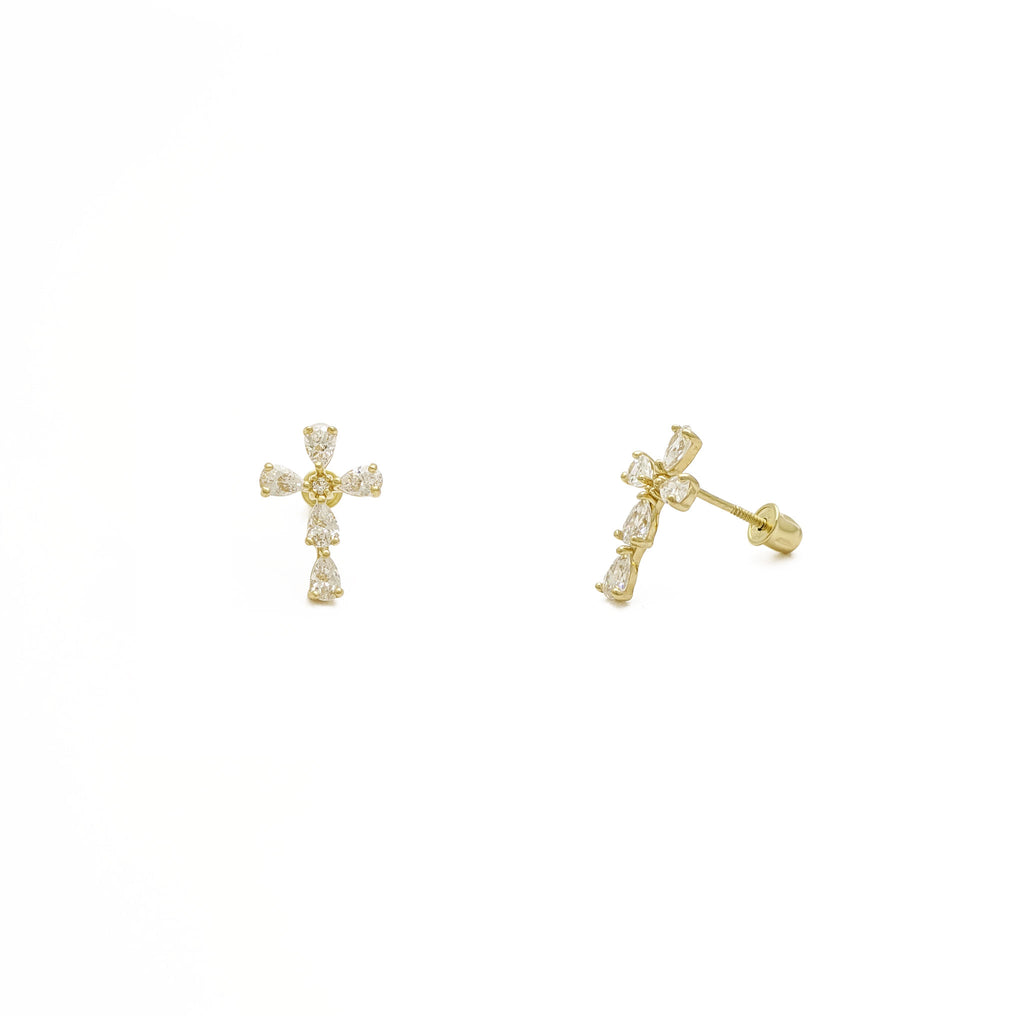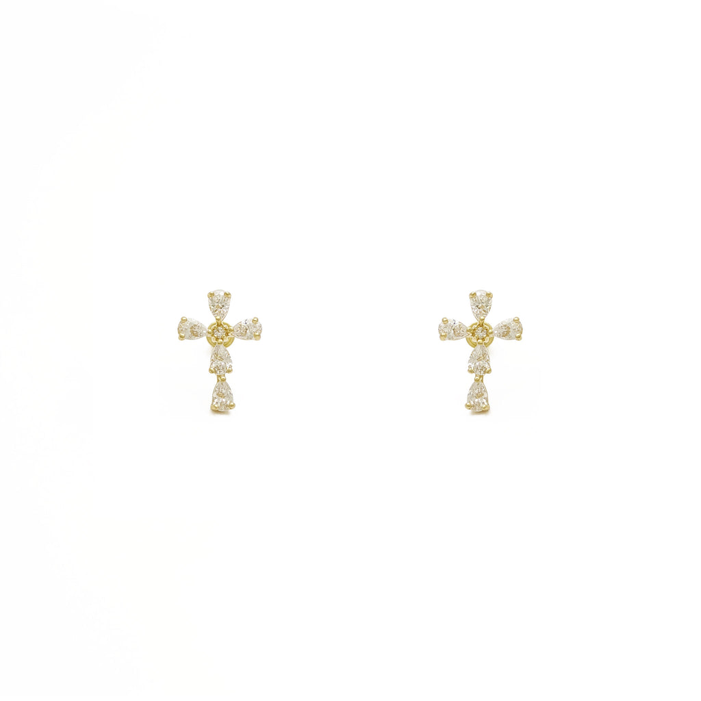 These small cross earrings feature pear-shaped zirconia gemstones connected in the center by a solitaire round zirconia, slightly resembling a cross pattée. A pair of heavenly earrings that will grace the wearer's ears while religiously adding a little bit of gleam.