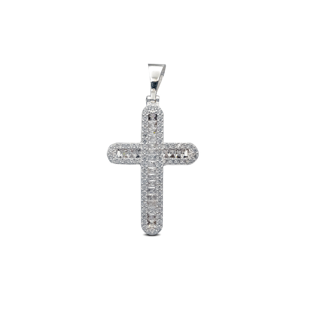 Iced-Out Baguettes & Round CZ Cross Pendant (Silver)