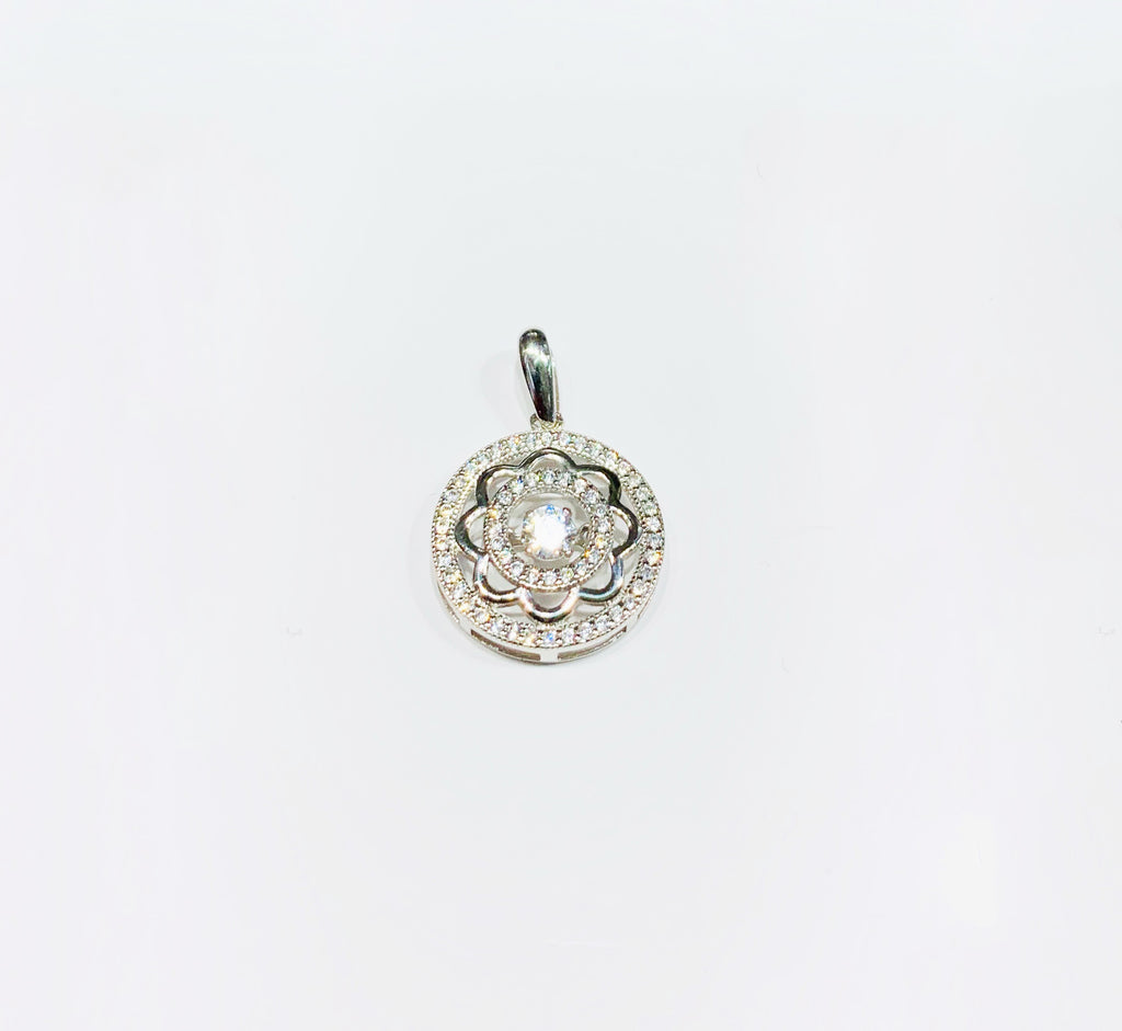 This is a Round Flower Pendant with cubic zirconia stones.