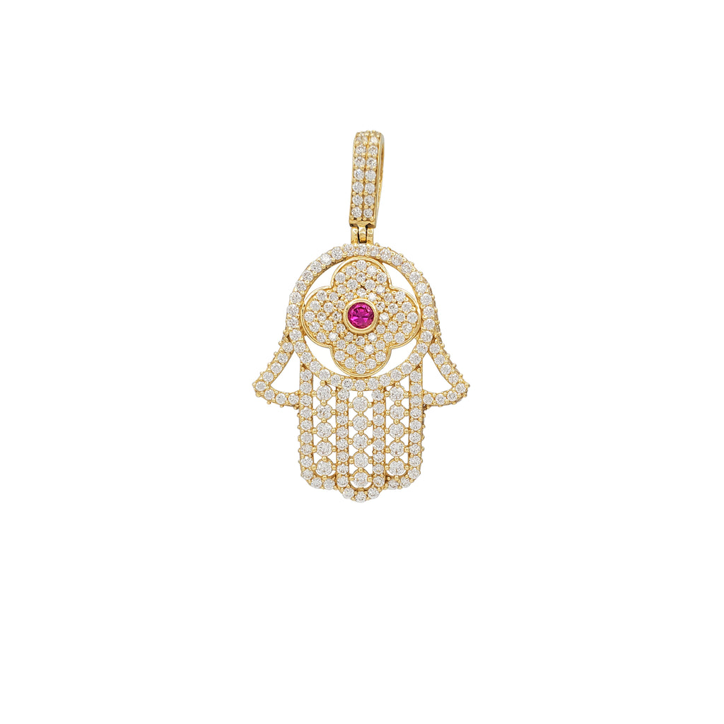 Iced-Out Red Eye Hamsa Hand Pendant (14K)