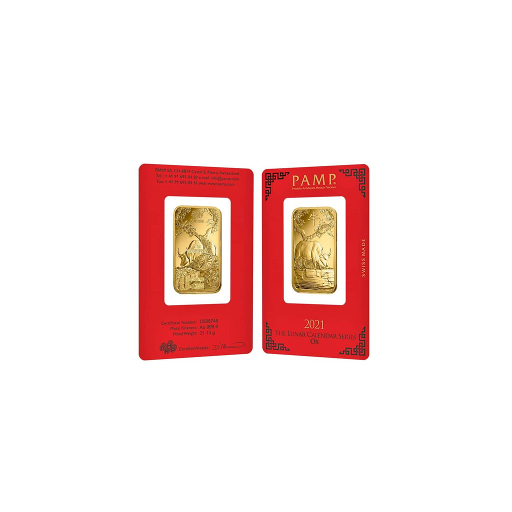 Obverse: Displays the back view of the ox bending down to drink water, along with a detached wagon wheel and a cart full of coins. Inscriptions include the bar’s serial number, weight, and purity, and PAMP Suisse logo.