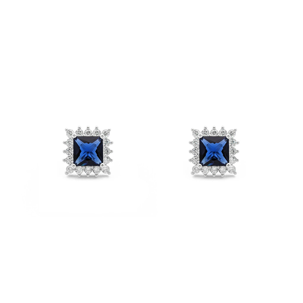 Blue Stone Princess-Cut Halo Stud Earrings (Silver)