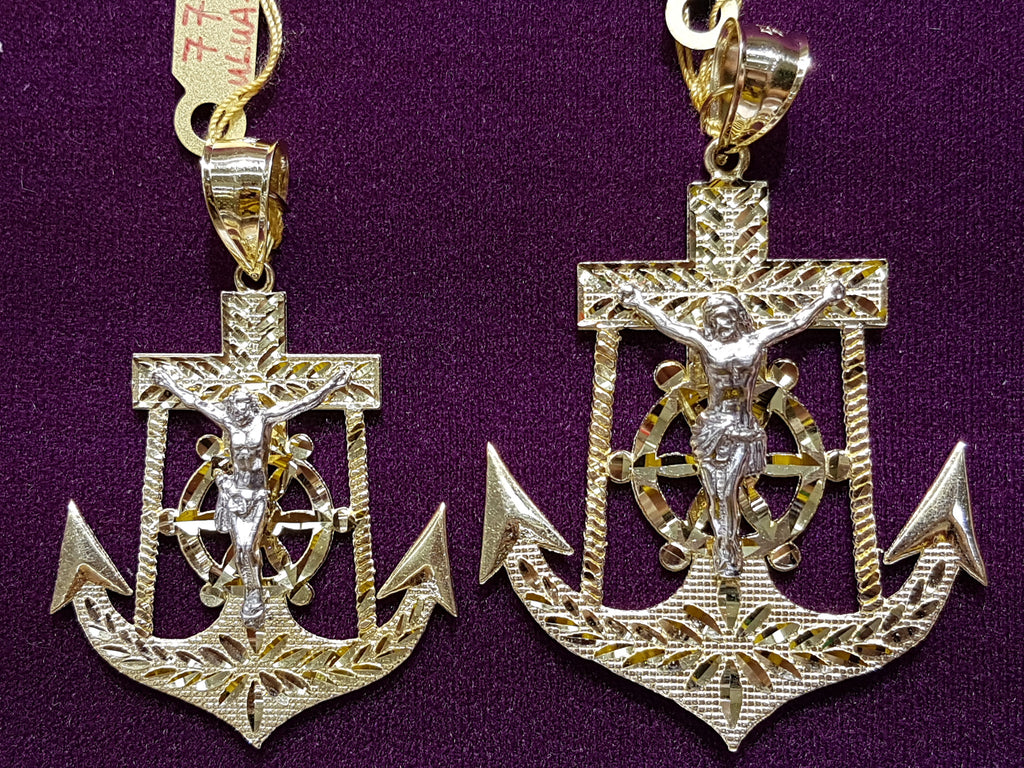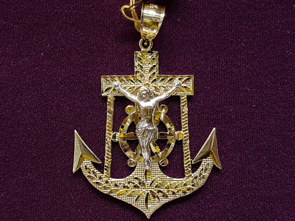 This pendant features a depiction of the Crucifixion set upon a meticulously detailed anchor.