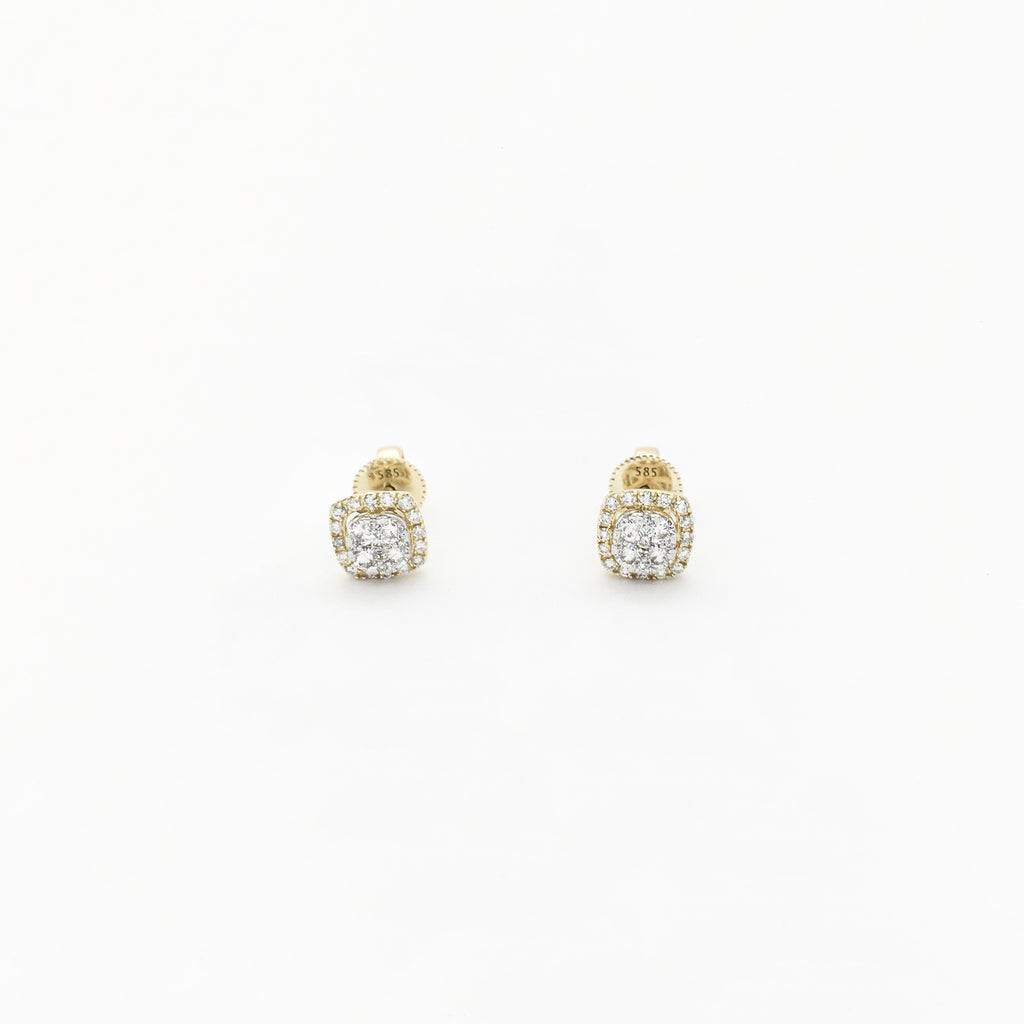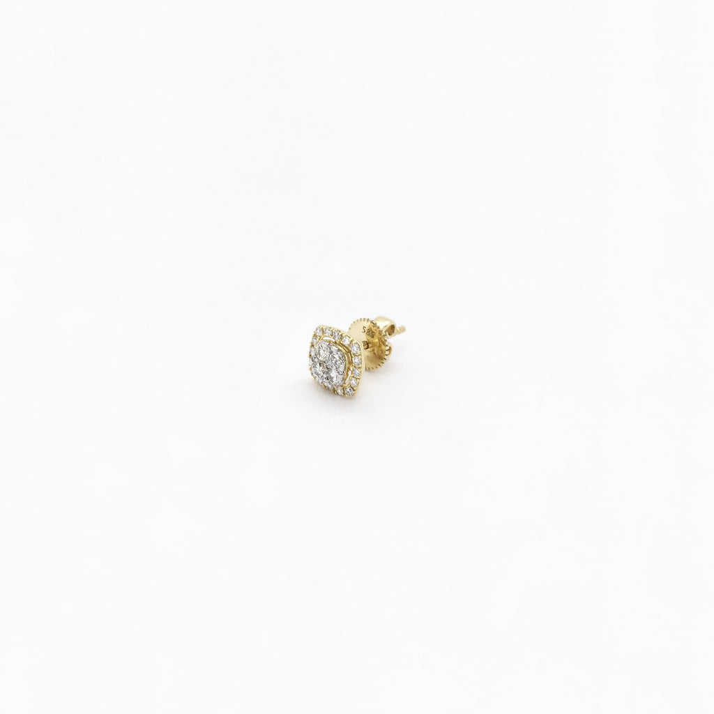 Round brilliant diamonds are clustered together to ice a cushion shape stud earring bordered by a brilliant halo. The earrings back are push types for more convenient use to such an impressive piece of jewelry.