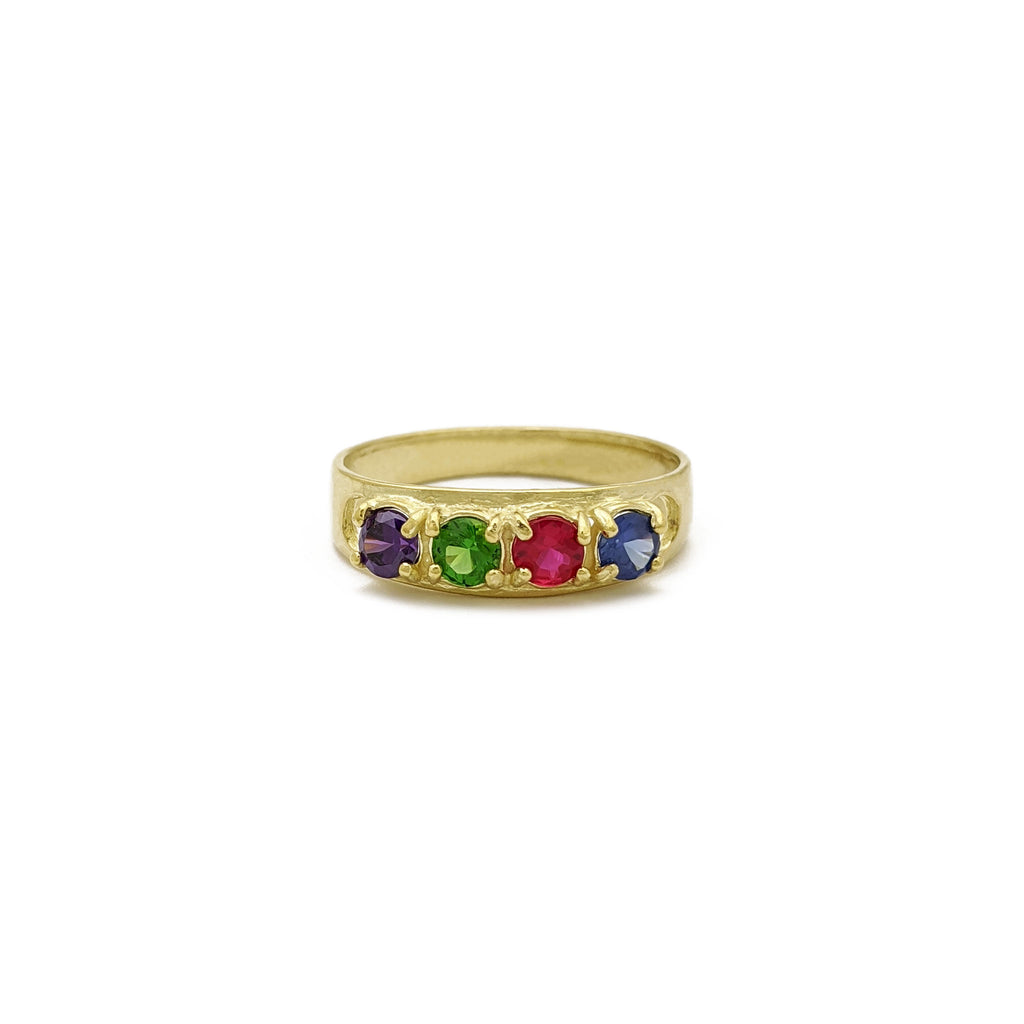 A birthstone ring featuring four gemstones set to represent the birth months of four offsprings. Featured in this ring, the purple gem represents February, the green one represents the month of August, the red one July, and the blue one September.