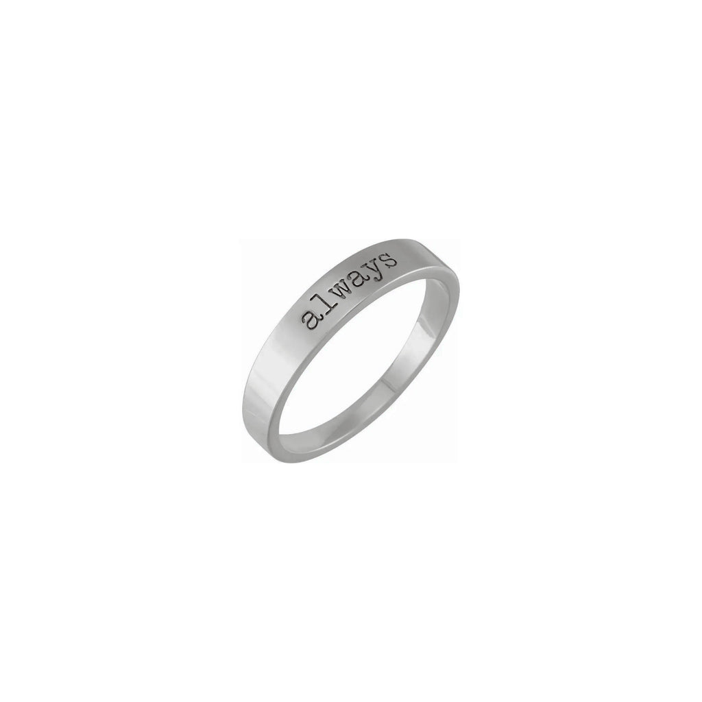 A classy stackable band featuring a laser engraved word in typewriter font reading 'always'. Perfect to assert and remind us of the pleasant repetition of actions and events.