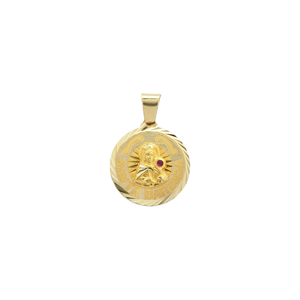 This divine piece features Saint Barbara carrying its scepter with red cubic zirconia set in a 14 karat gold medallion framed with diamond cuts.