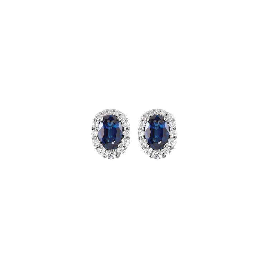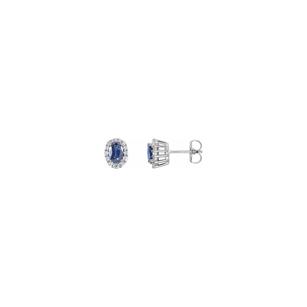 Blue Sapphire and White Diamonds Oval Halo Stud Earrings (14K)