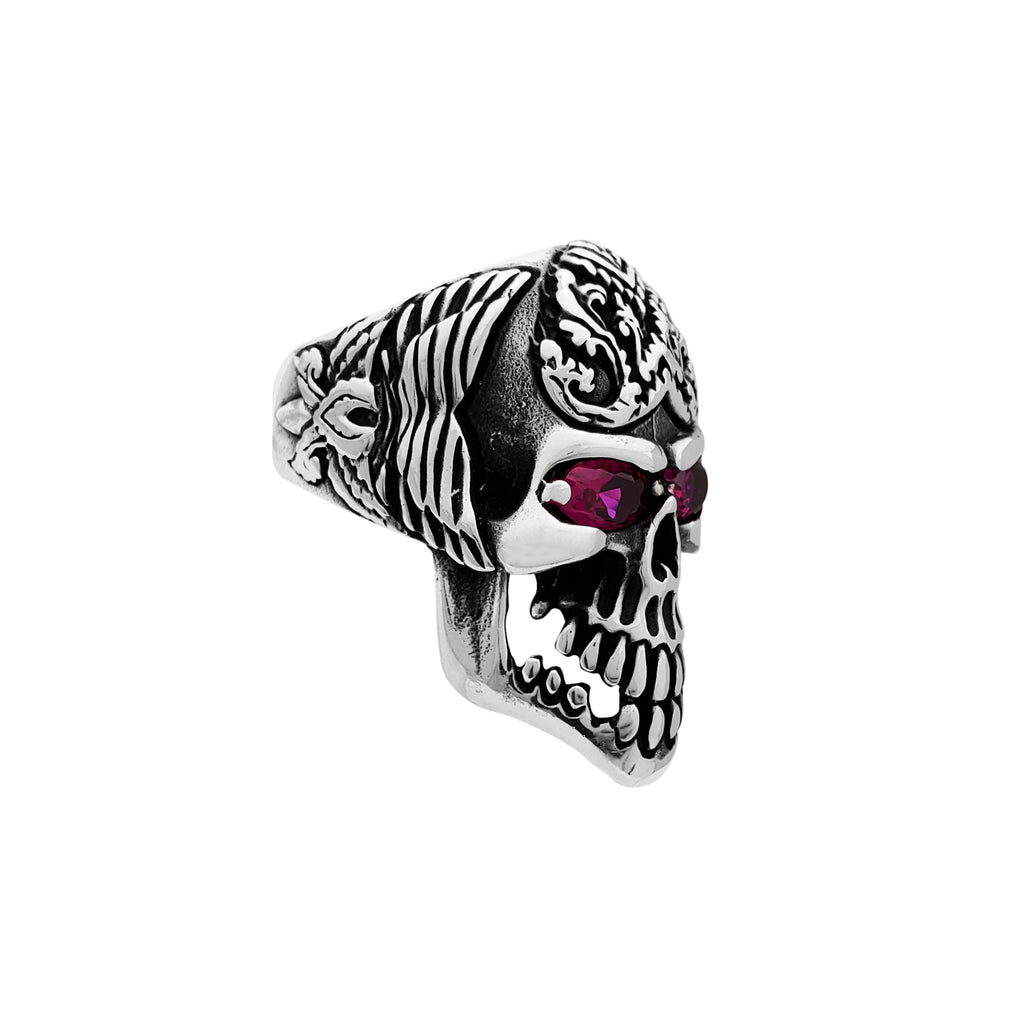 Antique Finish Red-Eyes Skull Ring (Silver)