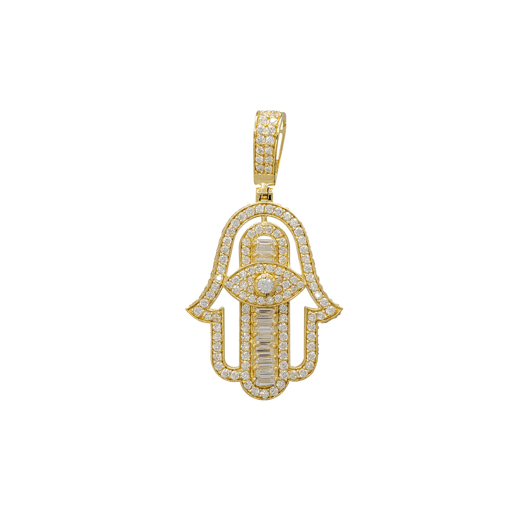 Zirconia Baguettes & Round Bezel Hamsa Hand Pendant (14K)