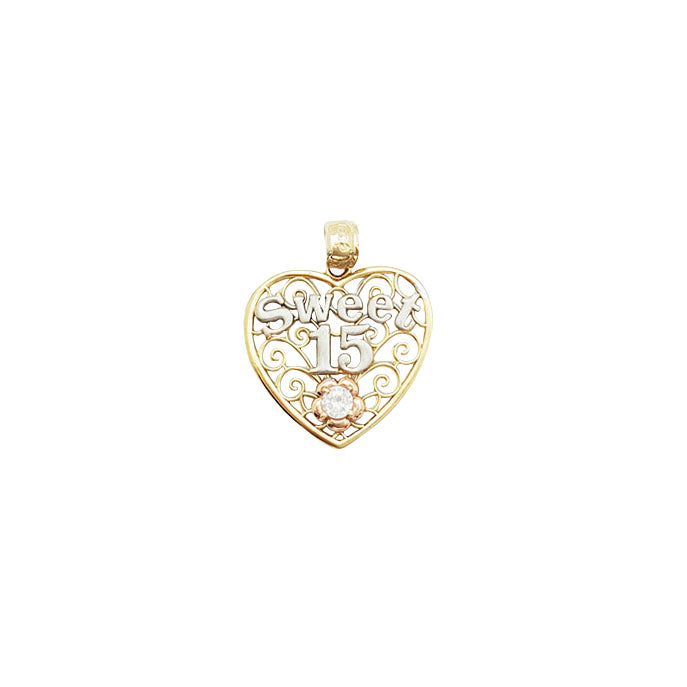 Tricolor "Sweet Fifteen" Quinceanera Heart Pendant (14K)