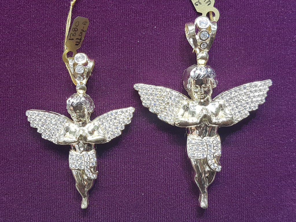 This pendant features an infant angel with studded robe and wings. A semi-hollow mesh backing adds a little weight to cater to those that prefer a heftier feel around their necks.