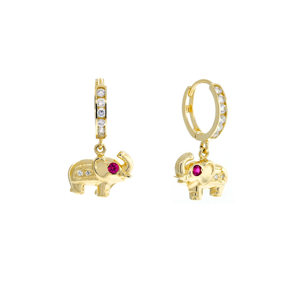 Zirconia Red-Eyes Elephant Hanging Huggie Earrings (14K)