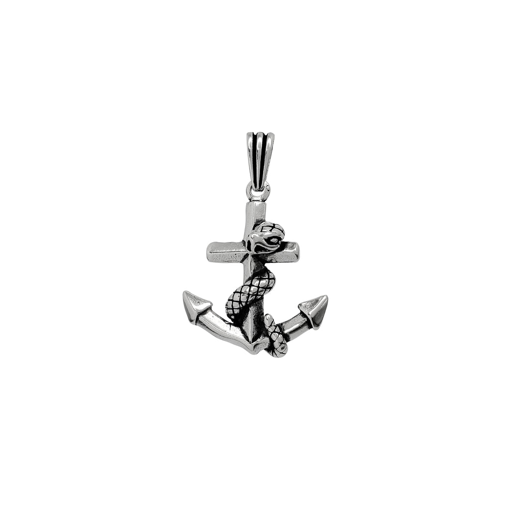 3D Antique-Finish Snake Wrapping Spiky Anchor Pendant (Silver)
