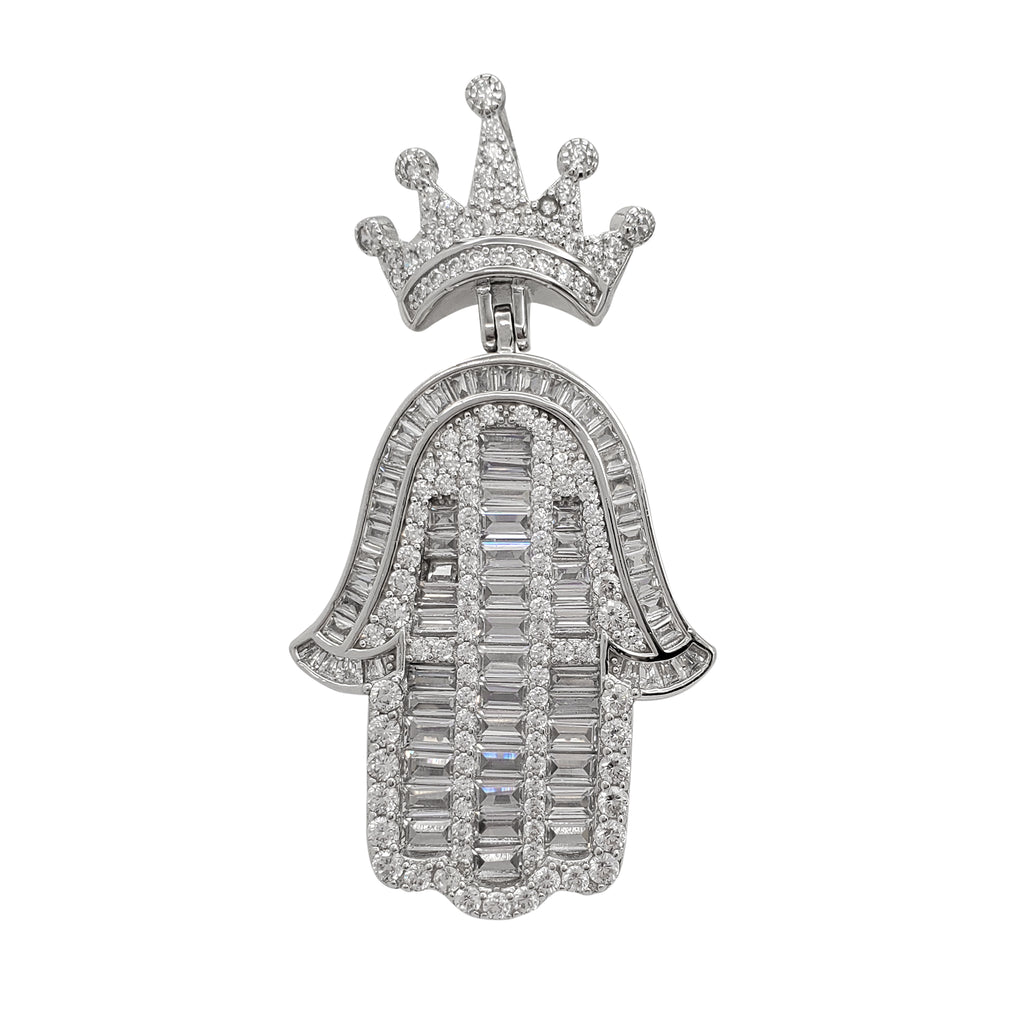 Stone-set Crown Bail Baguettes Hamsa Hand Pendant (Silver)