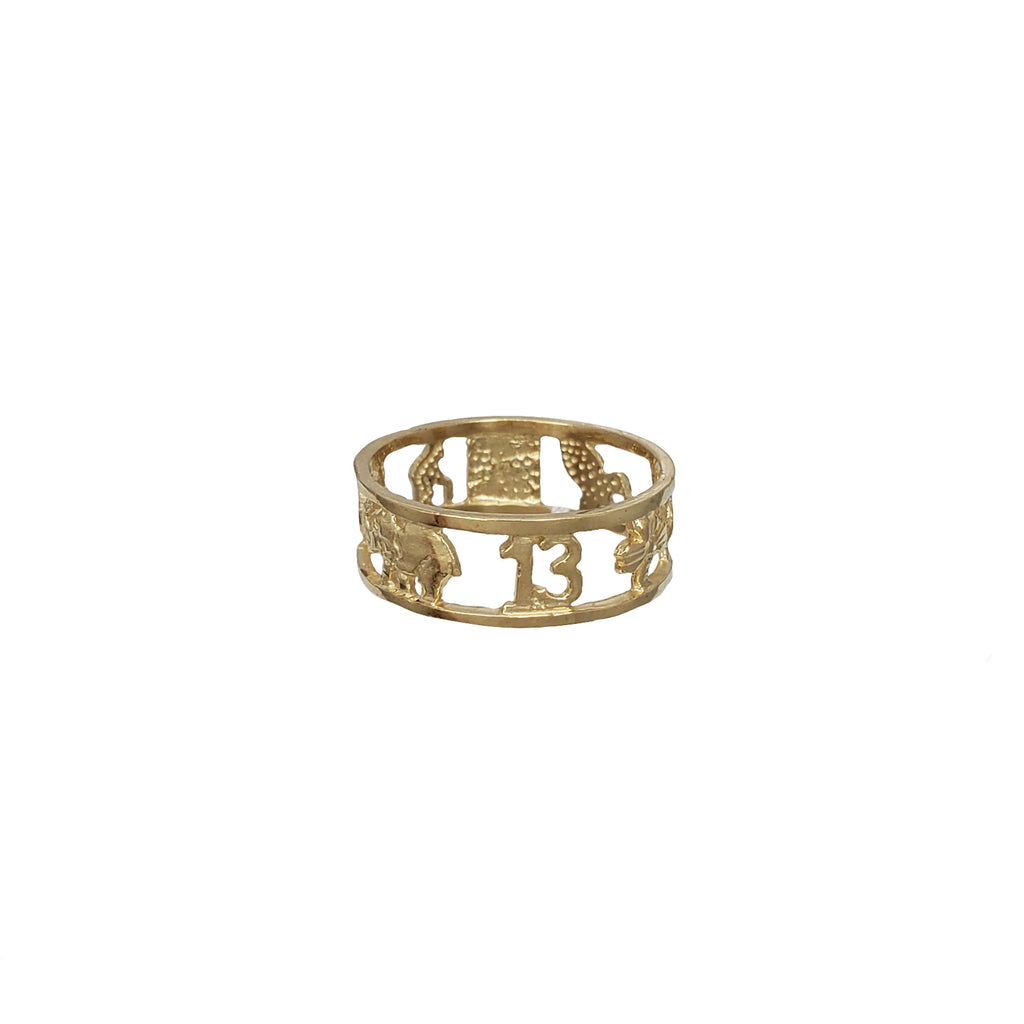 • Design: Openwork band featuring symbolic motifs — Elephant, Number 13, and other protective charms