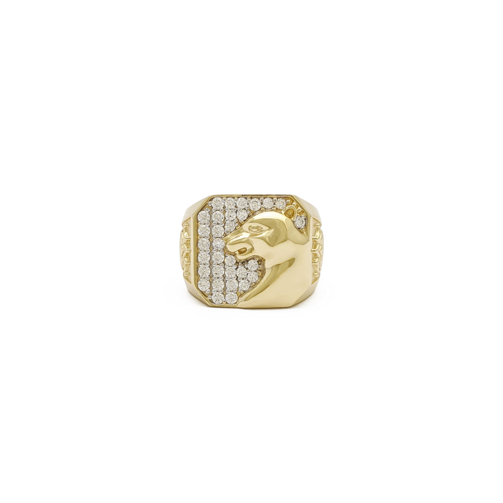 This signet ring features a shiny panther profile on the right side standing out from an icy background created by round white zirconia gemstones set together. A king's crown topped diamond motif on each side of the ring complements the overall look of the piece.
