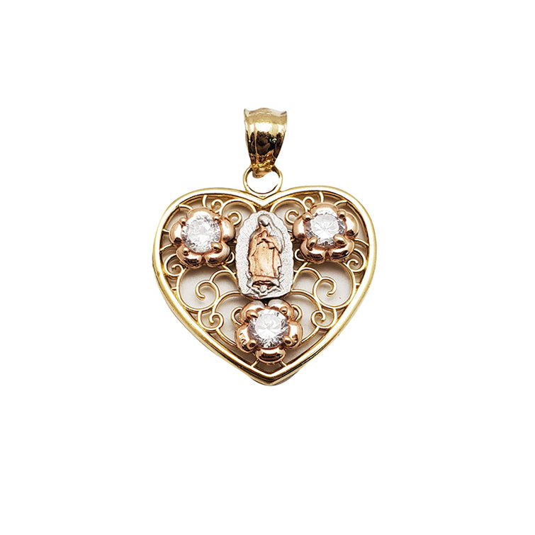 Tri-Color Heart Frame Guadalupe Pendant (14K)