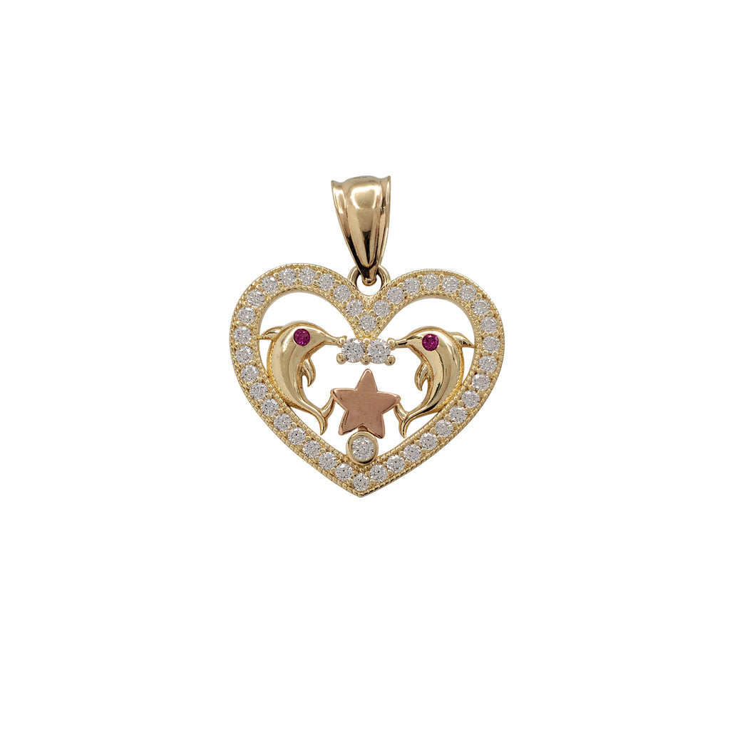Zirconia Halo Heart Dolphins Pendant (14K)