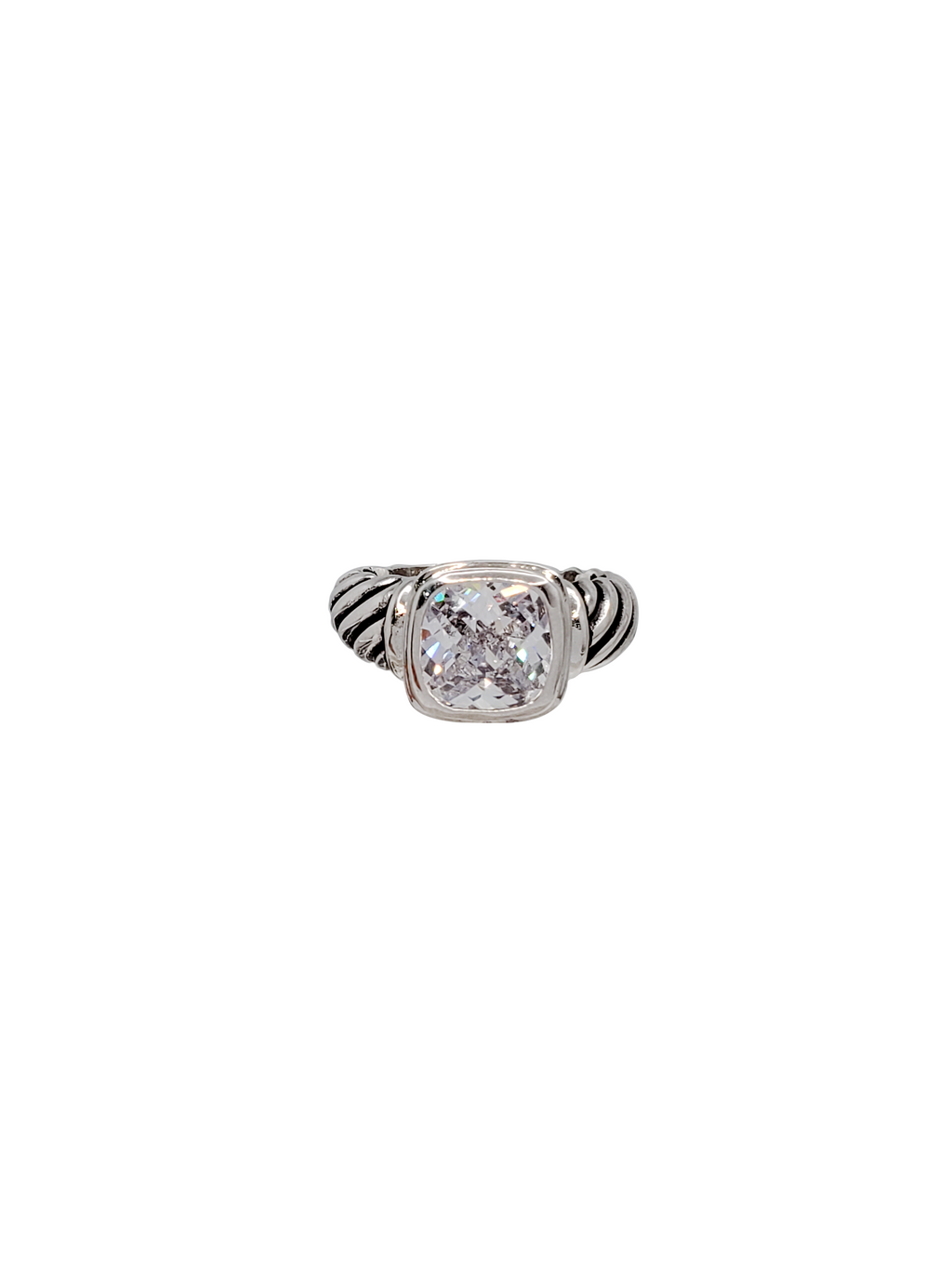 Motif Cushion Cut Bezel CZ Antique-Finish Rope Ring (Silver)