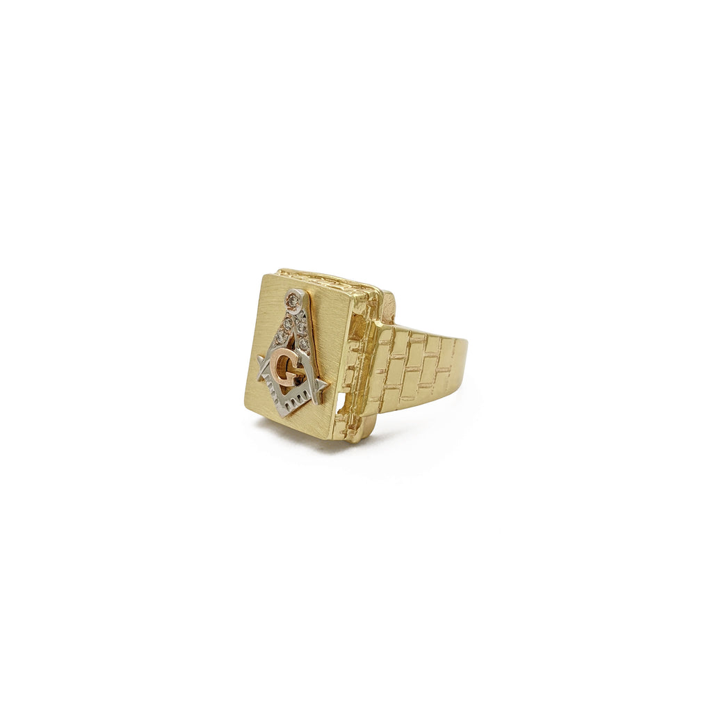 This ring features a masonic symbol set over a brushed finish signet flanked on the side by brick-like designs. A few small white diamonds accents the compasses that compound such a particular symbol.