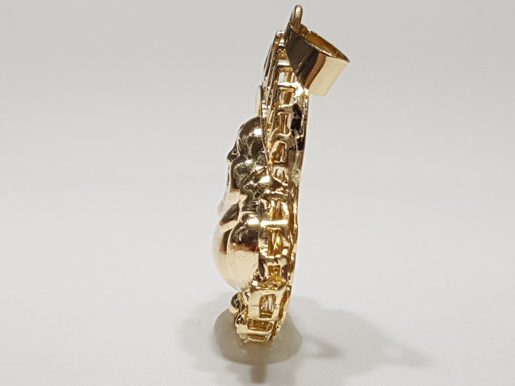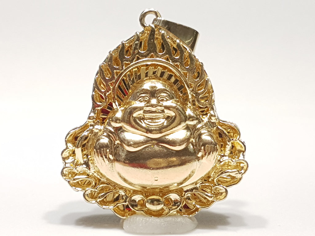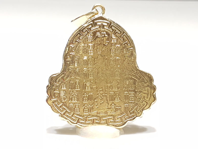The Laughing Buddha in all its glory. The front of the pendant features the full body of Buddha, while the back features a mosaic of ancient Chinese scriptures.