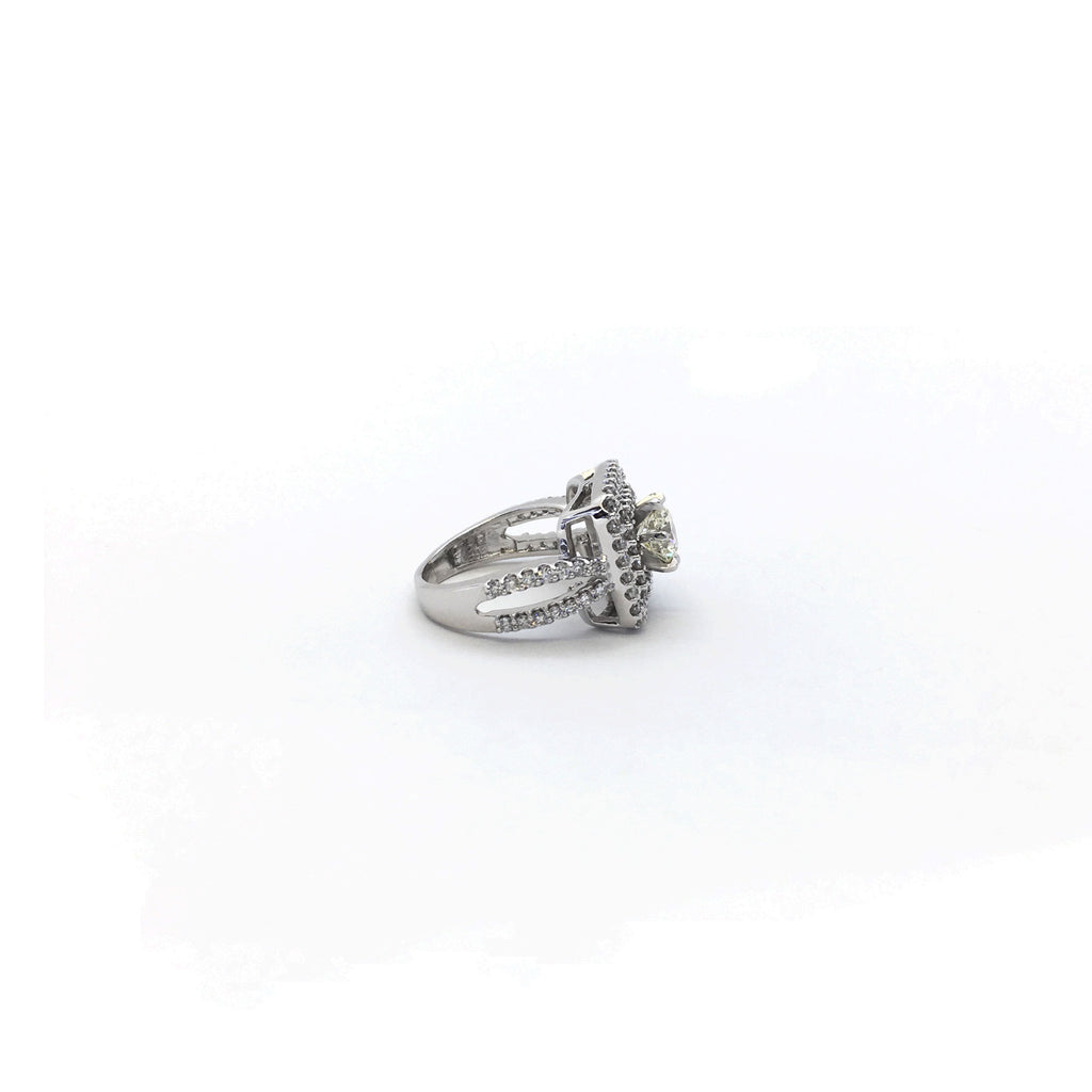 Two rows of diamond halos surround a round diamond in this impressively gleaming engagement ring with interlaced shiny sides.