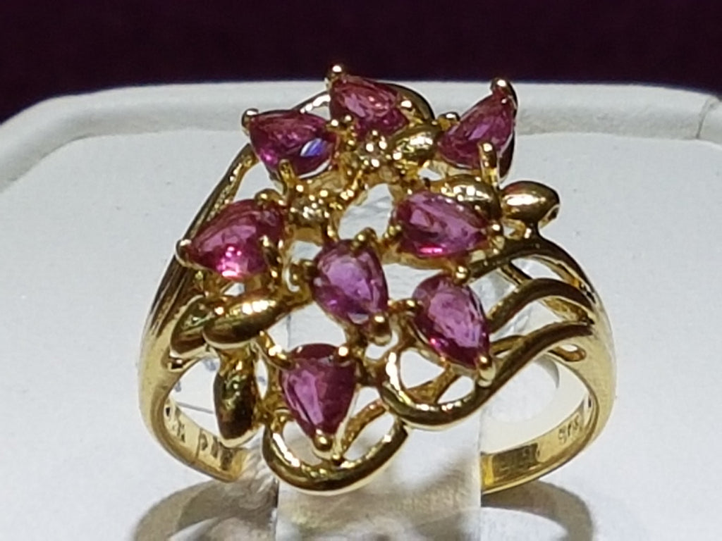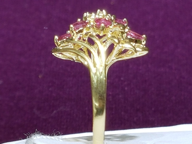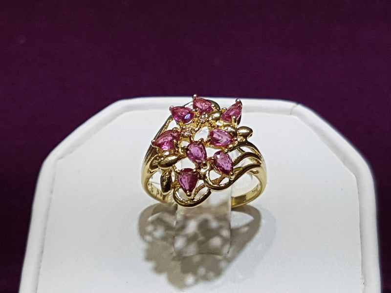 This ring features a weave of yellow gold and pink rubies, emulating a floral overgrowth.