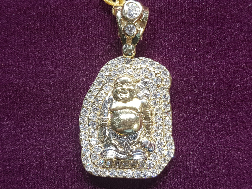 This golden pendant features a white-robed Laughing Buddha emitting a glorious, icy aura.