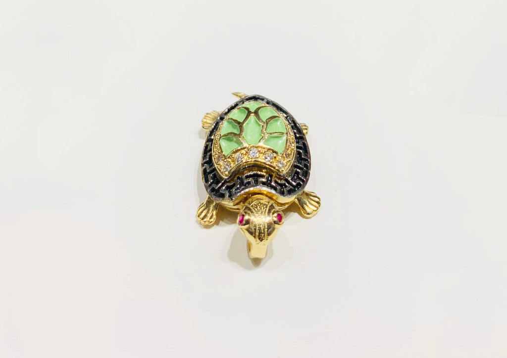 A charming turtle with sparkling red zirconia eyes features a meander pattern bordering its green shell delighted with an outline of bright cubic zirconia gemstones and surprising.