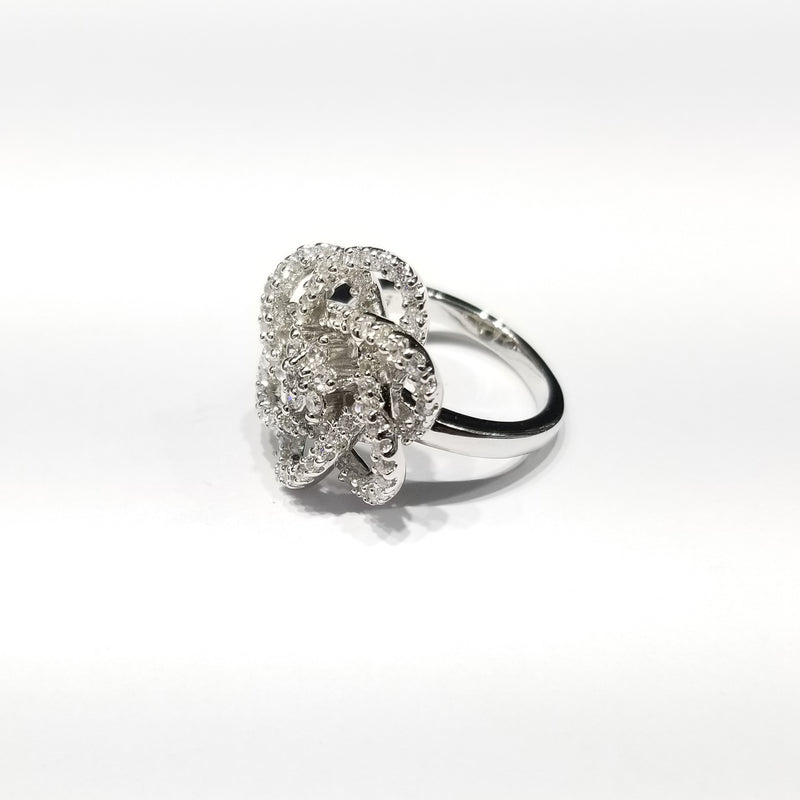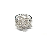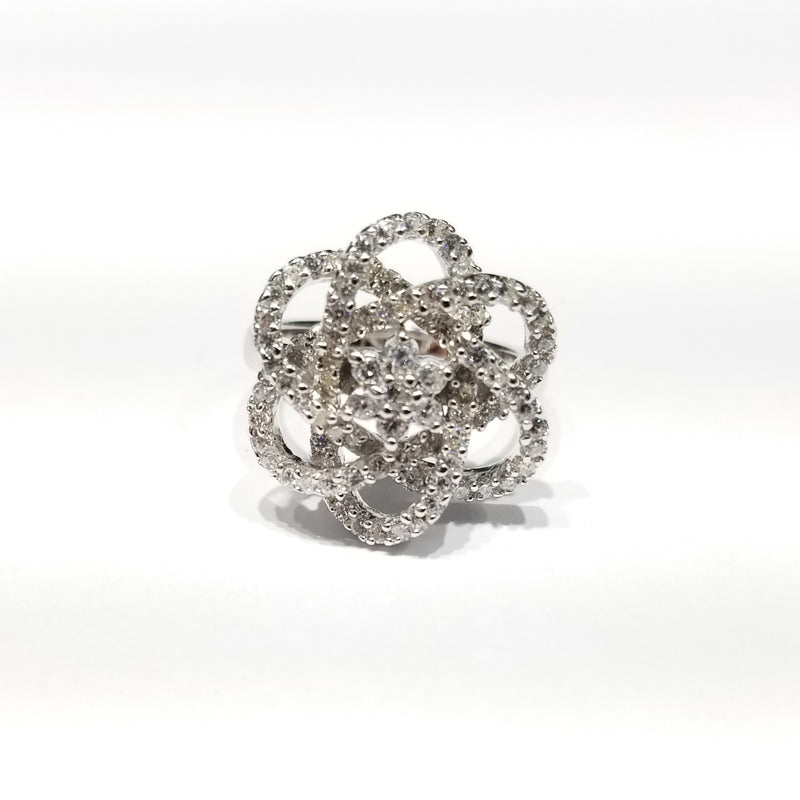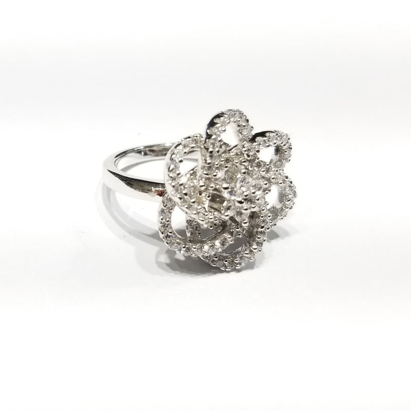 This is a brilliant spiral flower ring made out of cubic zirconia stones.