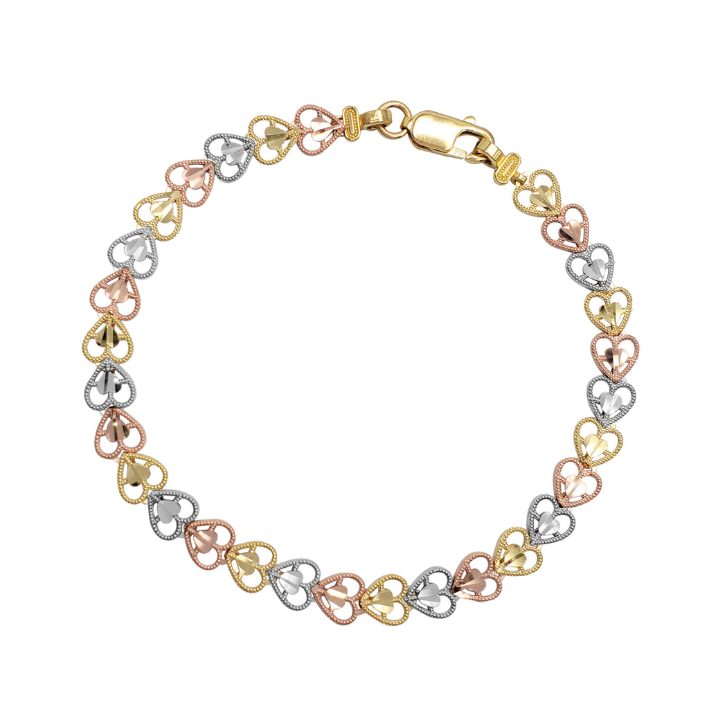 Tricolor Outlined Milgrain Halo Hearts Bracelet (14K)